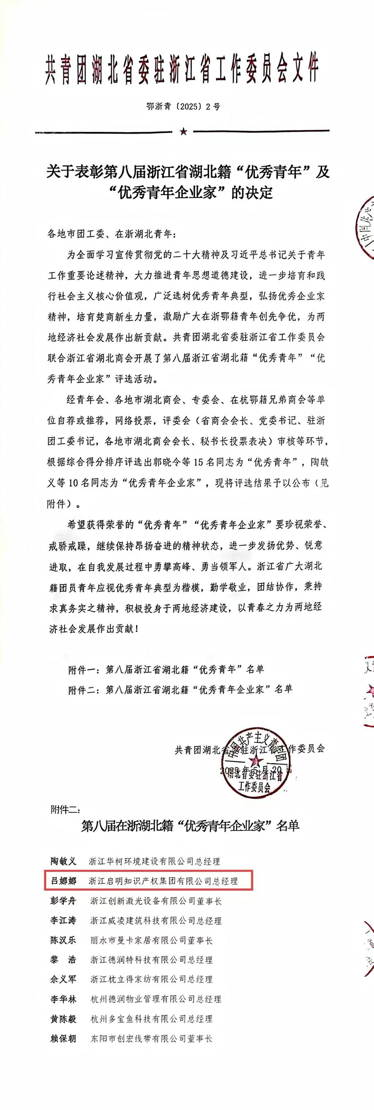 近日,第八屆浙江省湖北籍“優(yōu)秀青年”及“優(yōu)秀青年企業(yè)家”評(píng)選結(jié)果正式揭曉,我司總經(jīng)理呂娜娜榮獲浙江省湖北籍“優(yōu)秀青年企業(yè)家”稱號(hào)。